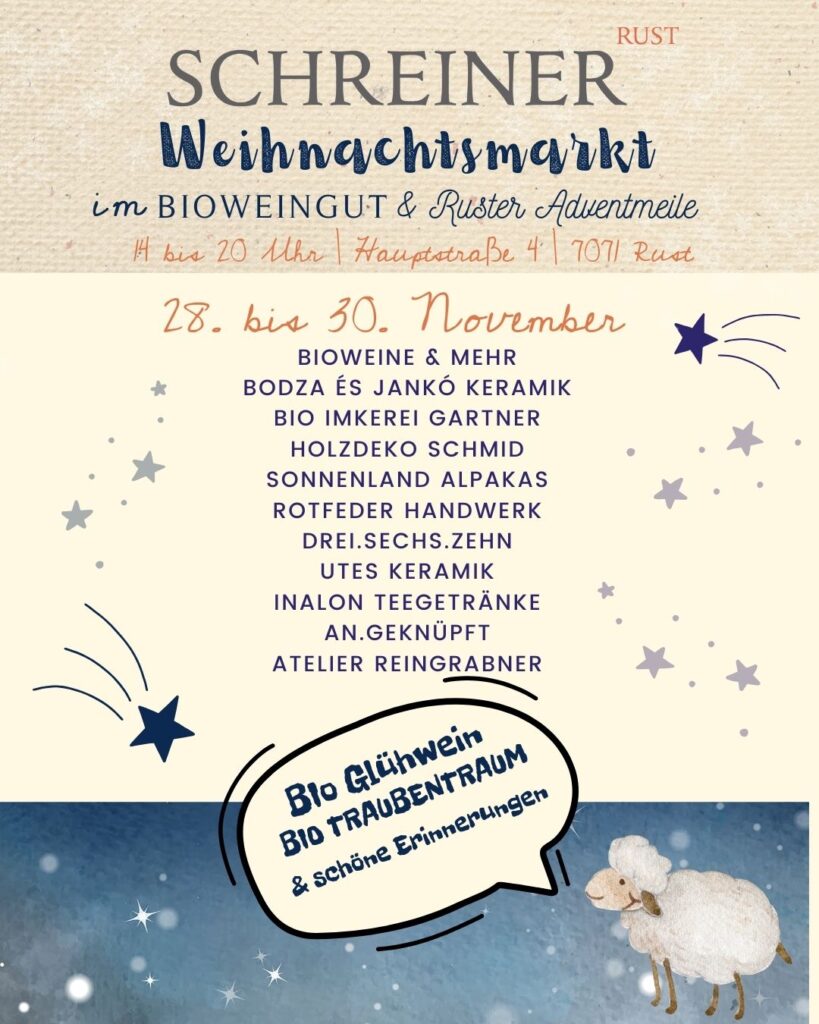 Lass dich von der Ruster Adventmeile verzaubern. Geniesse kulinarische Besonderheiten und ausgefallenes Kunsthandwerk. Besuche unseren Stand im Bioweingut Schreiner und koste unseren Instant-Tee und Gin.